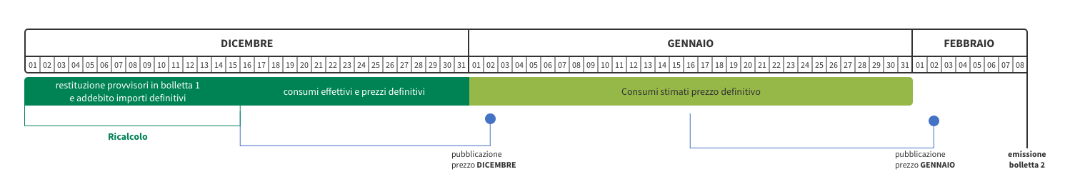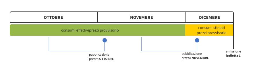 In questo esempio, dal momento che la bolletta è emessa il 15 dicembre, il prezzo della Cmem di ottobre e novembre è definitivo, mentre la Cmem di dicembre è provvisoriamente valorizzata in base al prezzo valido per il mese di novembre: il prezzo definitivo di dicembre sarà noto solo entro il secondo giorno lavorativo di gennaio.